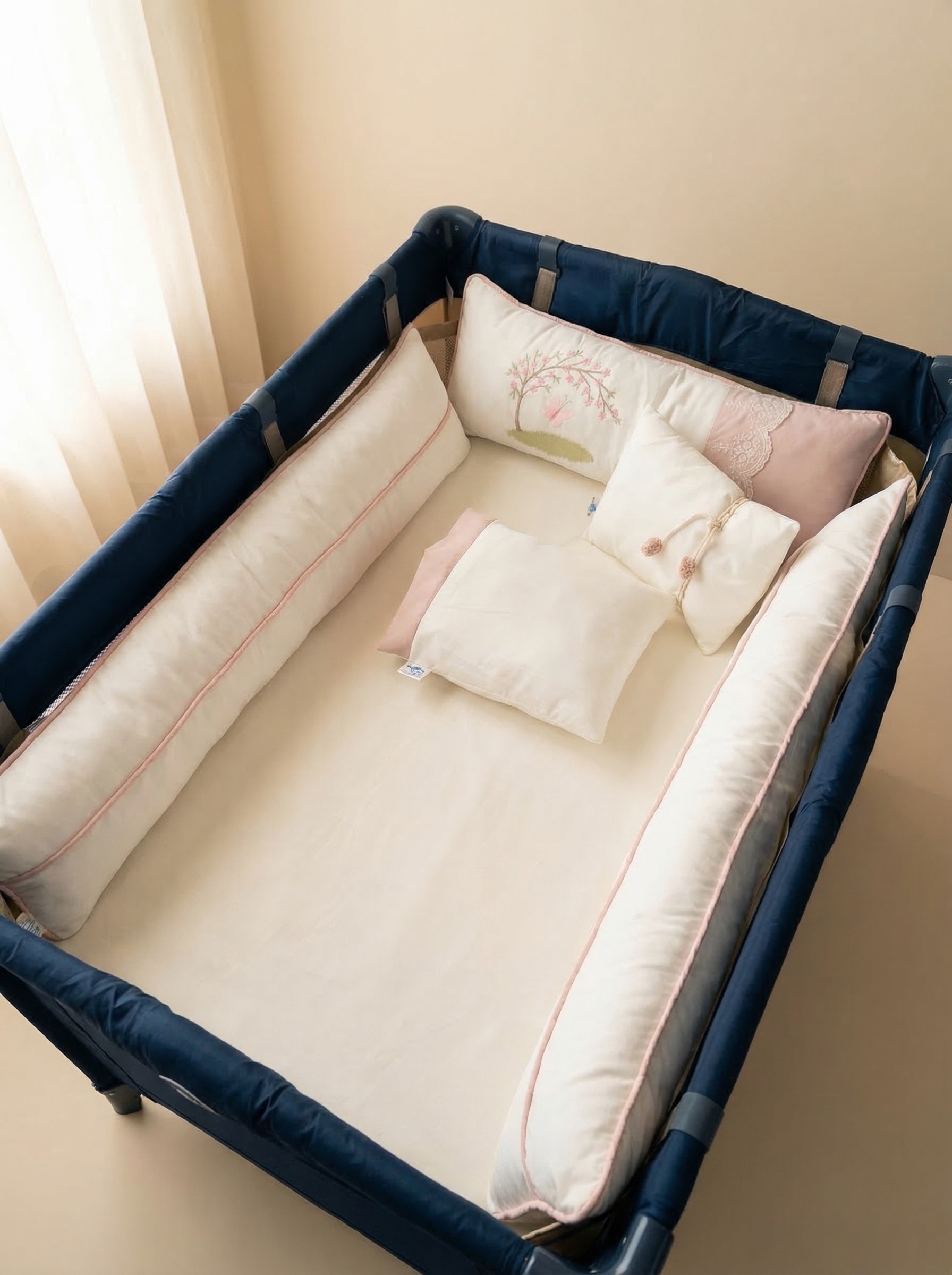 Transforme o berço portátil da sua pequena em um verdadeiro jardim! O Kit Jardim traz a delicadeza da natureza com bordados e estampas suaves, criados exclusivamente para se ajustarem com perfeição em berços desmontáveis e cercados.